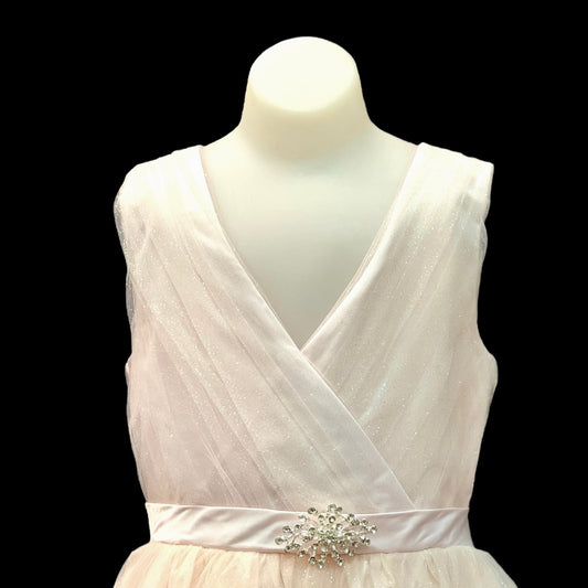 Sleeveless Glitter V-Neck Tulle Blush Dress w/ Rhinestone Brooch (Size 12)