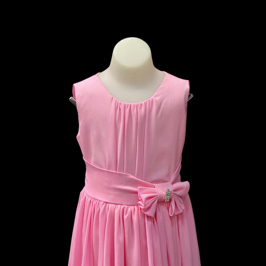 Sleeveless Pink Dress w/ Cascading Ruffle Skirt & Rhinestone Bow