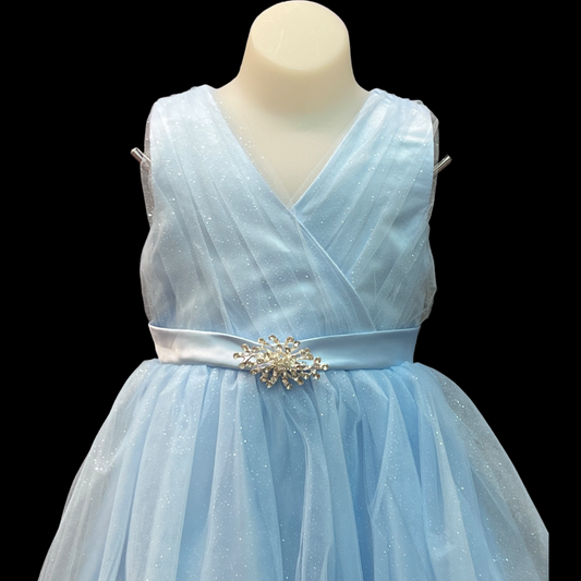 Sleeveless Sky Blue Glitter V-Neck Tulle Dress w/ Rhinestone Brooch