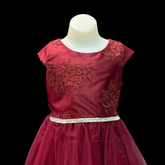 Cap Sleeve Burgundy Floral Embroidered Tulle Dress w/ Rhinestone Belt
