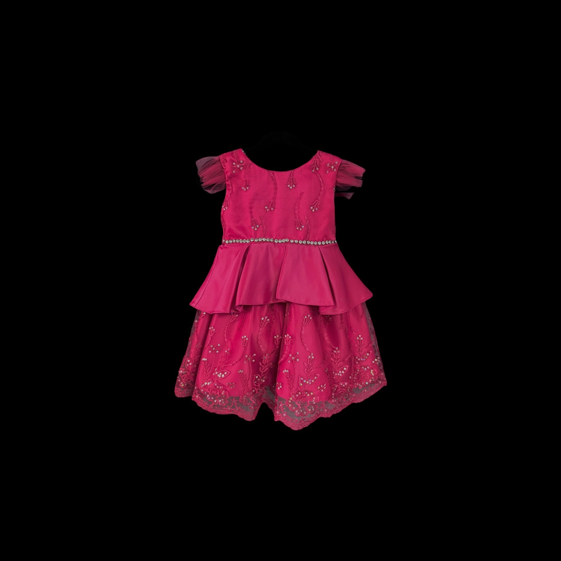 Dress your little one in timeless elegance with this stunning fuchsia dress for baby girls, perfect for weddings, birthdays, and special occasions. The satin bodice features delicate sequin embroidery, adding just the right amount of sparkle. A rhinestone sash at the waist enhances the look and leads into a layered satin peplum over a voluminous embroidered organza tulle skirt. The crinoline underlayer and soft lining provide extra fullness and comfort, ensuring a graceful silhouette. Designed with a convenient zipper closure and an adjustable tie-back sash, this dress combines style with ease of wear. Crafted with care by Fancy Kids, it is a picture-perfect choice for any celebration.