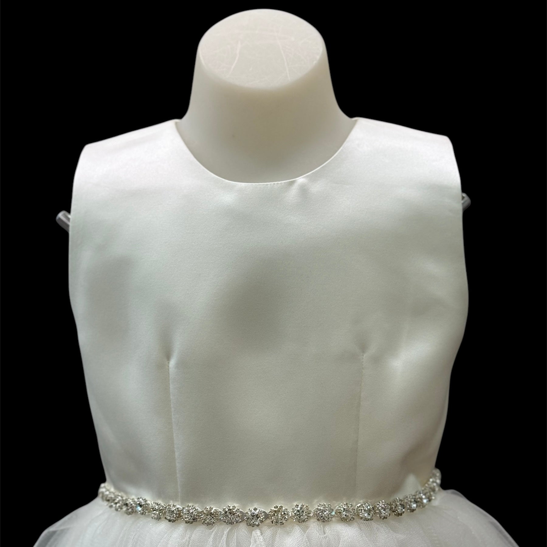Enhance your flower girl or communion dress with our dazzling rhinestone belt paired with a flowing white sash. The sparkling rhinestones and elegant organza create a sophisticated accessory that adds a touch of glamour and grace, making every special occasion truly unforgettable.