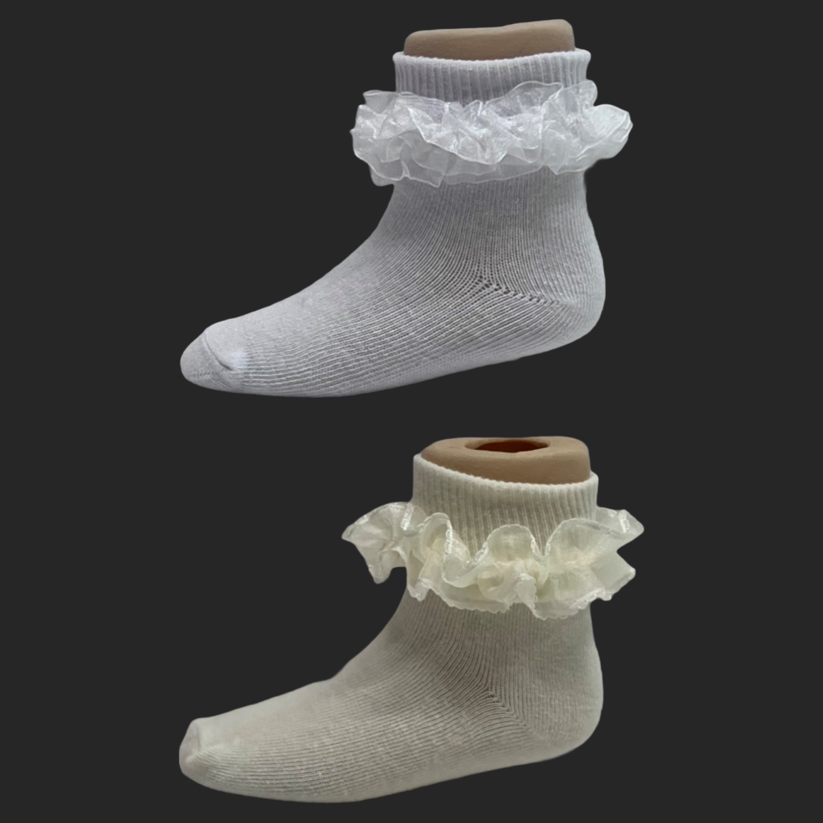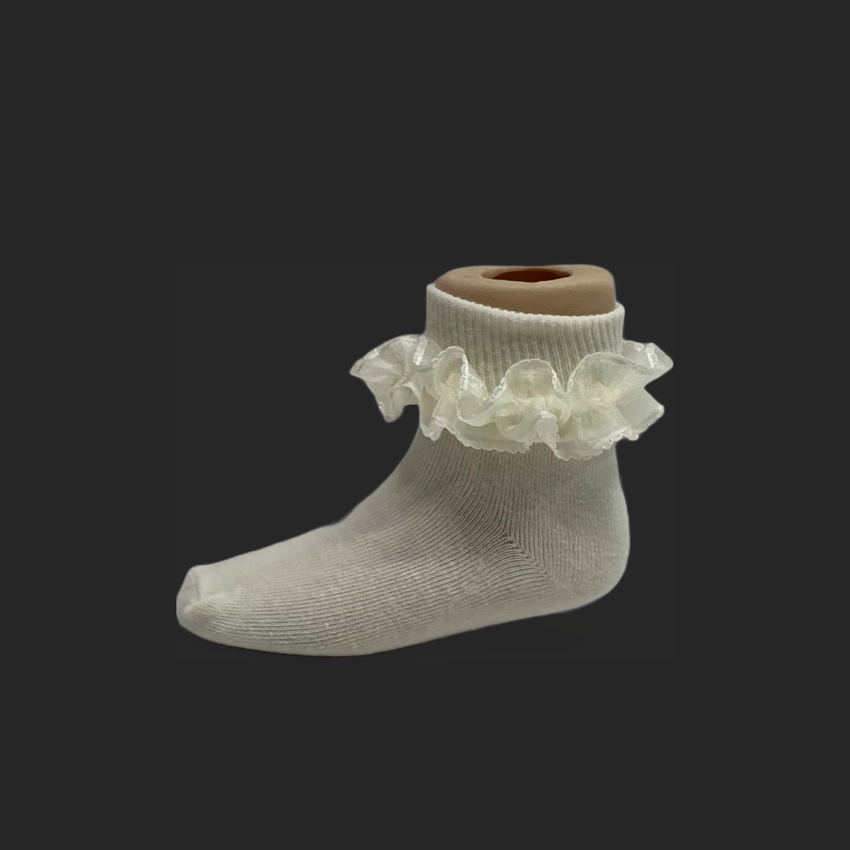 Soft and comfortable to wear. Stretchable fabric made from 80% cotton, 15% polyester and 5% spandex. Organza ruffle sock with lace trim. Hand wash with cold water. Produced by Hip hop, Jolene.